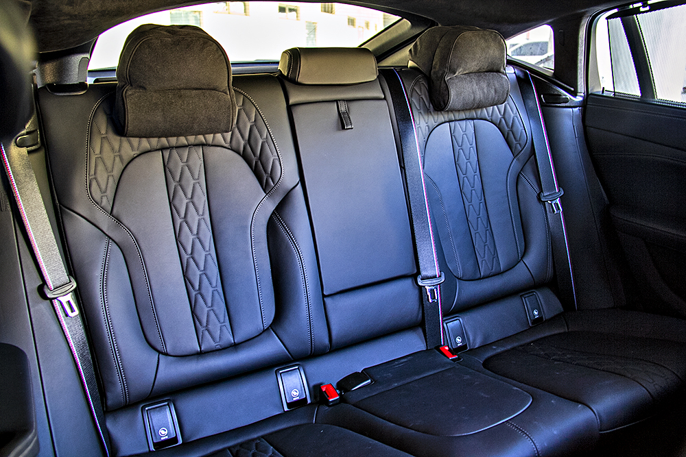 前排座椅M造型的桶椅卖相不俗,头枕下方的M标识为单色。整套座椅的包裹性、各种调节角度还是很到位,舒适和运动兼得。
