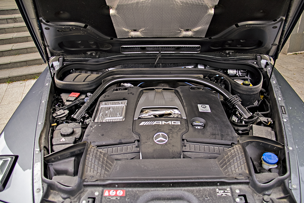 最后让我们言归正传来聊聊,AMG G 63最最核心的地方——动力总成。这是目前奔驰家族中“越野能力最强的性能车”,我相信这么说应该没有人会反对,这句话的意思就是放眼整个硬派越野车市场里,比它越野能力强但未必跑的比它快,而比它跑得快也未必越野就比它强,所以这是一个越野车圈的“黑洞”。