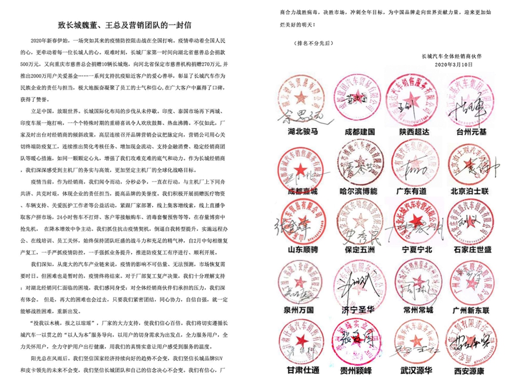3月10日,长城汽车收到124家经销商伙伴联名书写的《致长城魏董、王总及营销团队的一封信》,信中经销商伙伴对长城汽车在疫情期间的大力支持表示感谢。