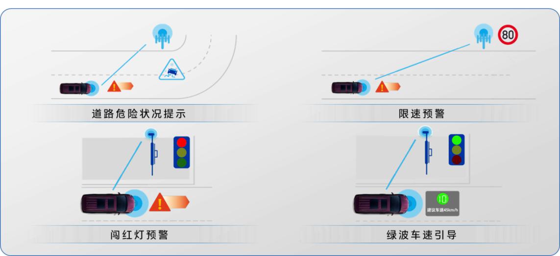 以车辆失控预警CLW为例,当前方车辆触发制动防抱死系统、车身稳定系统、牵引力控制系统等任意功能时,自身车辆根据接收到前车发出的广播信息,若判断前车属于失控状态且可能对自身造成危险,系统将对驾驶者发出警示,避免或减轻事故伤害;绿波车速引导GLOSA则是当车辆驶向交叉路口时,系统能够根据路侧单元发送的道路数据和信号灯实时数据,向驾驶者提供建议车速,以便经济、舒适地通过路口,无需停车等待,提高出行效率。