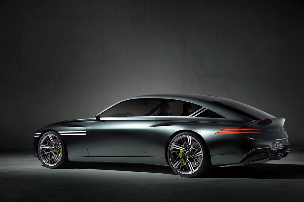 捷尼赛思X Speedium Coupe概念车的翡翠绿金属漆被命名为“仁济绿”。作为以韩国赛道为灵感的概念车,其车身颜色与赛道所在的山峦相映成趣,生动呈现动感、速度与永恒的优雅。