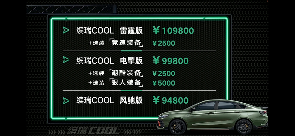 缤瑞COOL是吉利轿车年轻化的代表作之一,吉利汽车官方表示,缤瑞COOL的上市将降低轿跑市场门槛,让每个年轻人都有机会开上“轿跑”。缤瑞COOL将凭借其产品力和质价比,进一步增强中国汽车品牌在10万级运动轿车市场的竞争力,与思域等合资运动轿车展开正面竞争。