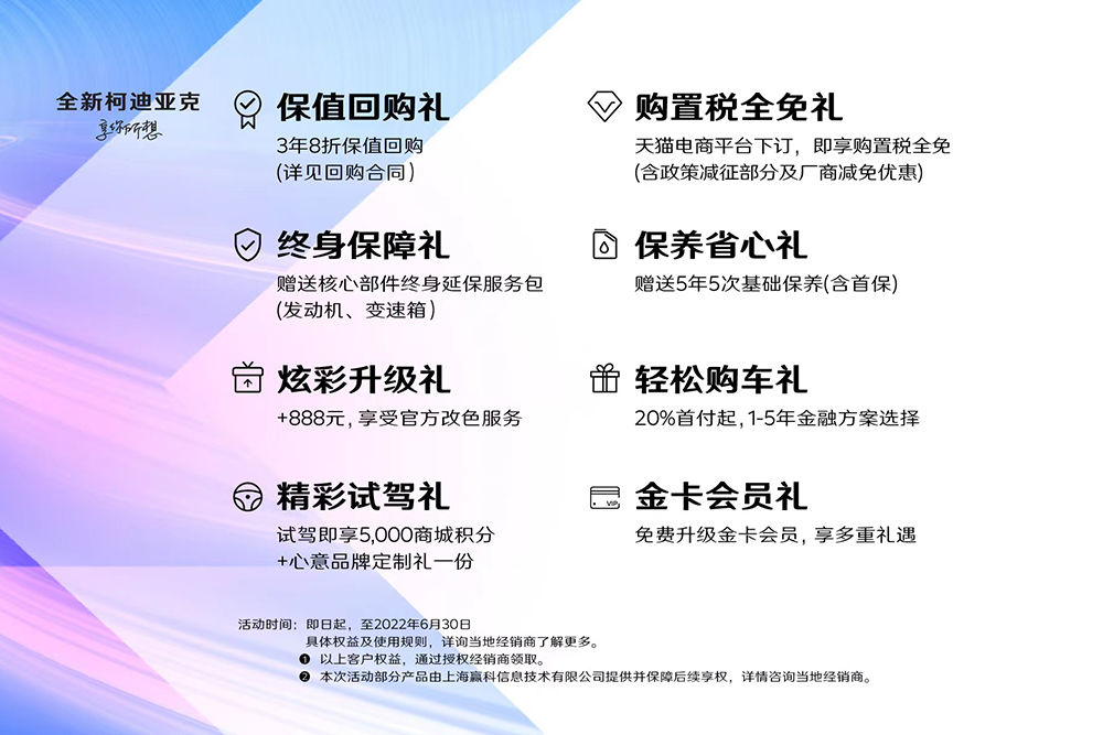 本次全新柯迪亚克上市,上汽大众斯柯达推出了多重诚意十足的购车礼遇。除了6月推出的购置税全免礼,购车用户还可享受3年8折保值回购、核心部件(发动机、变速箱)终身质保、官方改色服务、5年5次基础保养(含首保)、20%首付起1-5年金融方案等诸多权益。