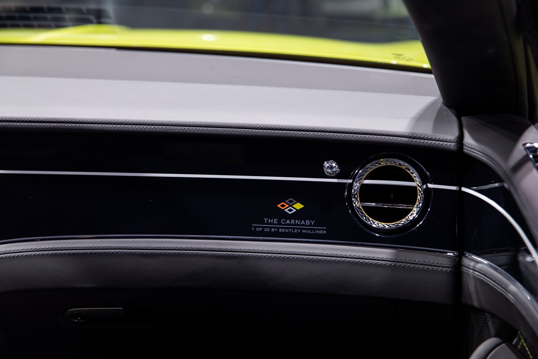22英寸黑色喷漆轮毂以北极白(Arctica)点缀,与风尚套件(Styling Specification)包含的北极白饰条互相映衬。独一无二的“The Carnaby”字样徽标装饰在车身前翼上。奢华座舱也呈现出富有活力的匠心设计。荧绿色皮革装饰、荧绿和银色的反衬色缝线流动贯穿于鲸鱼黑(Beluga)皮革之上。精致瞩目的中控台以新款深色菱形纹铝制工艺打造。仪表板饰面和座椅靠背刺绣均精致装饰靓丽的四色菱形图案,其四个菱形的颜色完美呼应了该系列限量车型的四款配色,并选择该车型车漆颜色对应的菱形予以填色。值得细细品味的每一寸细节,无不跃动着限量版车型所专属的明快精巧设计,以及穆莱纳部门的精湛手工技艺。