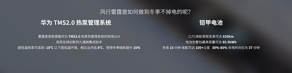 首先,风行雷霆首搭华为TMS2.0热泵管理系统,可适用零下18℃以下的超低温环境,相比行业低8℃,使得冬季续航提升16%。其次,风行雷霆所搭载的铠甲电池,充电1次,CLTC续航里程至高可达630km。电池包整包最高容量可达85.9kWh,能显著提升整车的续航能力。