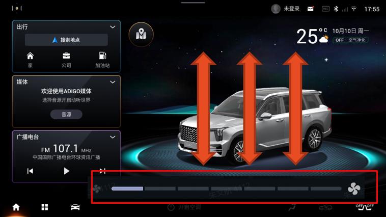 担心无法快速调节空调风量?本次OTA升级,GS8增加了便捷风量调节功能,进入系统桌面页面,双指上下滑动可快捷调节主副驾温度,现在增加三指快捷调节风量功能,通过上下滑动,快速调节空调风量,为用户打造一个更清爽舒适的驾乘空间。