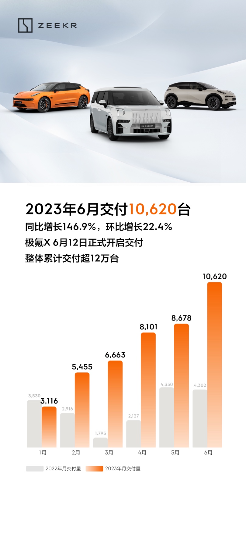 今日,极氪品牌公布了最新交付数据,其6月交付新车10620辆,同比增长146.9%,环比增长22.4%。