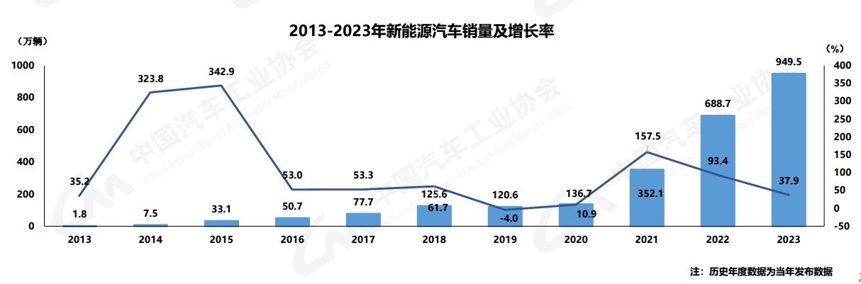 新能源化转型方面,2023年新能源汽车继续保持快速增长,连续9年位居全球第一。在政策和市场的双重作用下,2023年新能源汽车产销分别完成958.7万辆和949.5万辆,同比分别增长35.8%和37.9%,市场占有率达到31.6%,高于上年同期5.9个百分点。与之对比,2023年传统燃油乘用车国内销量1404.3万辆,比上年同期下降109.4万辆,同比下降7.2%。