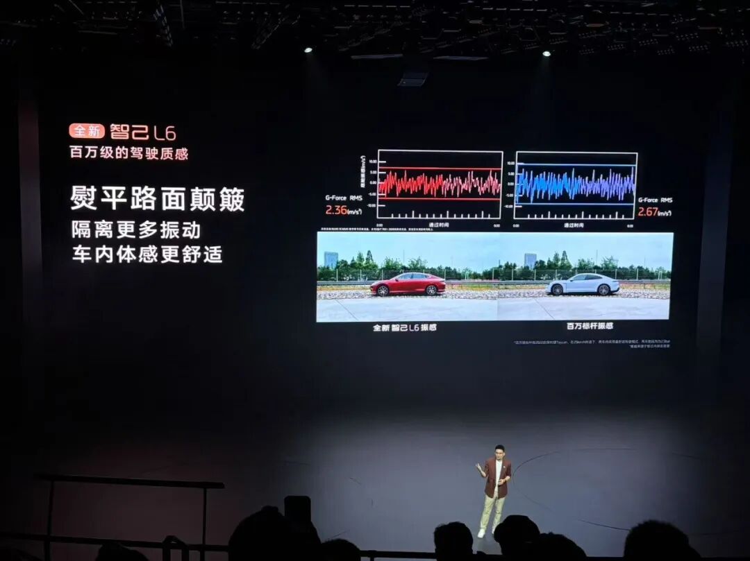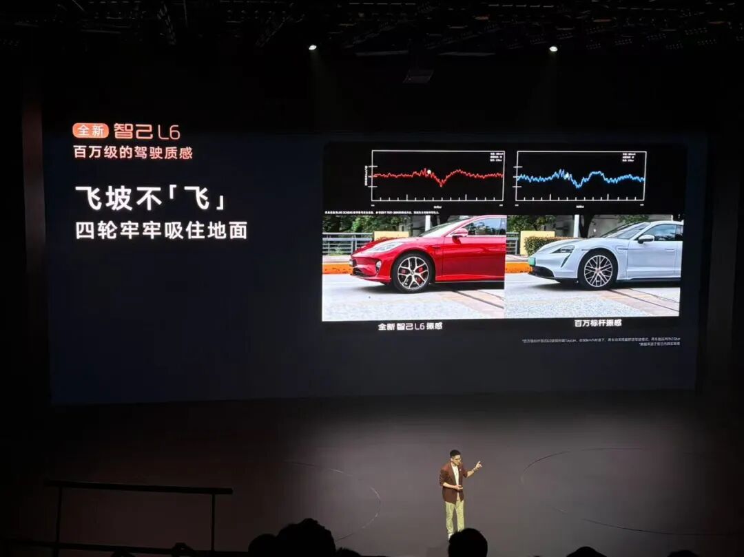 在发布会现场,官方也公布了全新智己L6与保时捷Taycan的底盘对比视频,可见全新智己L6面对颠簸路面时,底盘过滤震动效果更好,体感更柔和;在通过起伏飞坡路况时,对车身抛跳的抑制能力也优于竞品。