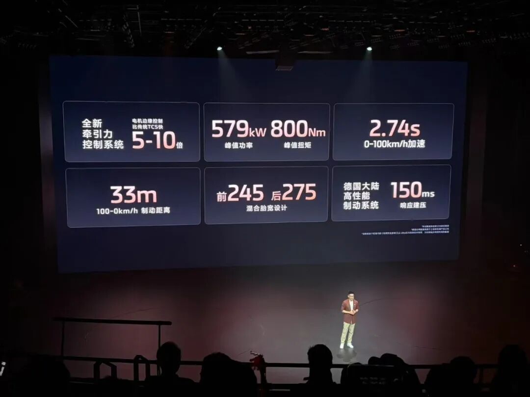 第三个看点,是四驱性能版车型的动力性能,其搭载了875V超快充平台和宁德时代100度三元锂电池,峰值功率为579kW,峰值扭矩为800Nm,零百加速仅需2.74s。
