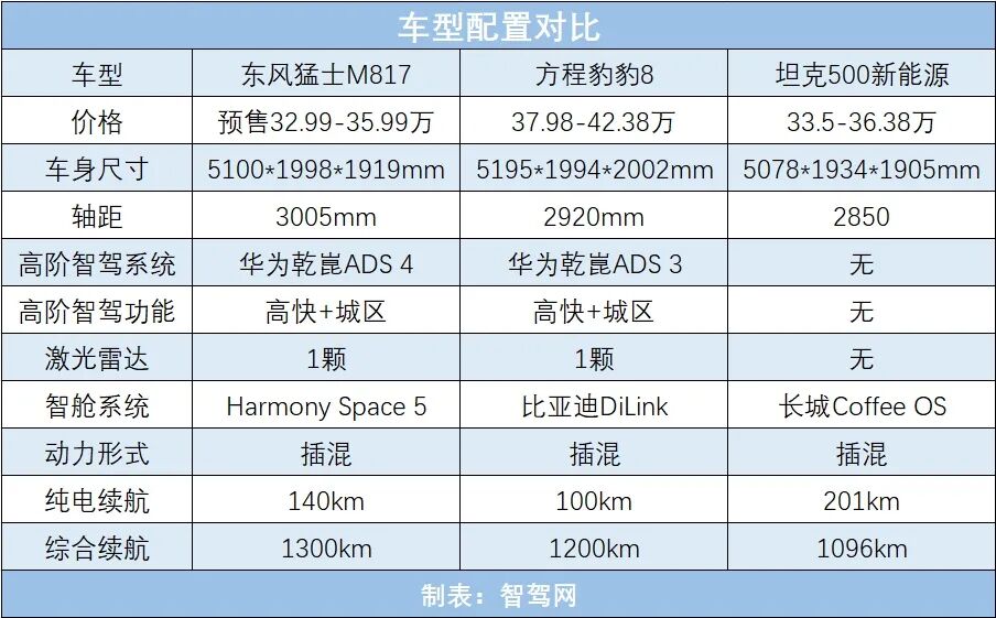 对于追求性价比的越野爱好者来说,东风猛士M817几乎找不到什么槽点,还在智舱、智驾能力上明显占优,相较于方程豹豹8和坦克500新能源有着更明显的竞争力。