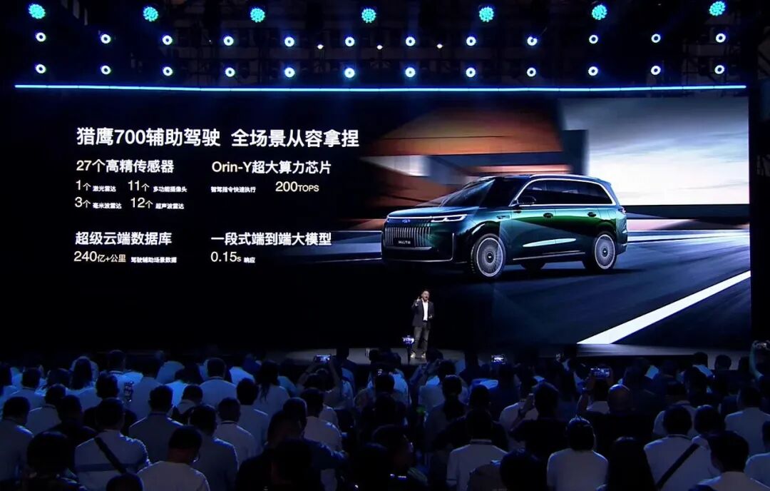 顶配版本的风云T11采用猎鹰700辅助驾驶系统(猎鹰500全系标配),配备27个感知单元与200TOPS算力芯片,支持高速NOA、端到端城市NOA与跨楼层记忆泊车等全场景智驾功能。