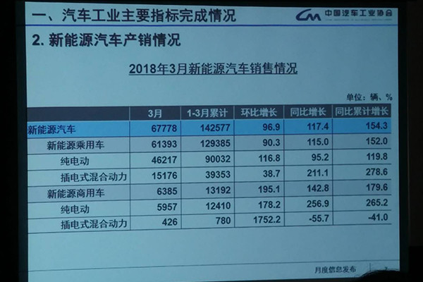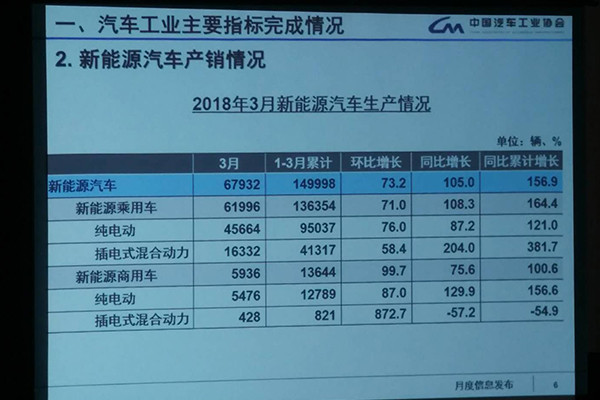 4月11日,中汽协发布2018年3月份汽车产销数据。在新能源汽车部分,3月份产销量分别为 67932辆和6777辆 ,同比增长分别为 105.0%和117.4%。