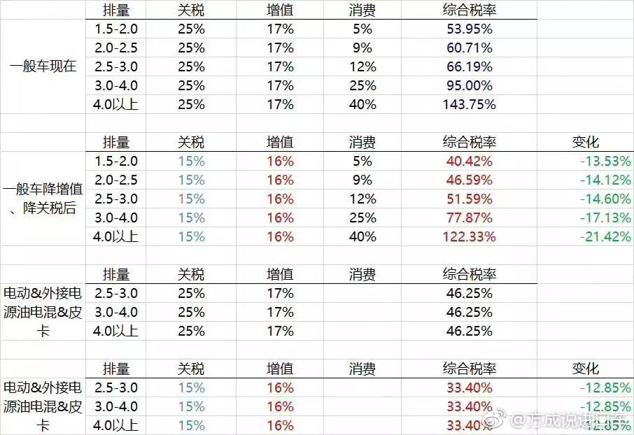 4.0L以上车型的综合税率下调了将近21%,而在销量最大的2.5-3.0L区间,关税下调高达22.7%。