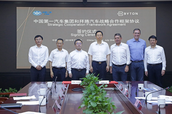 2018年7月2日,智能豪华电动汽车企业拜腾与中国第一汽车集团有限公司在南京签署了战略合作框架协议,双方将充分发挥产业协同作用,在平台技术、投资入股、零部件采购等方面开展一系列合作。