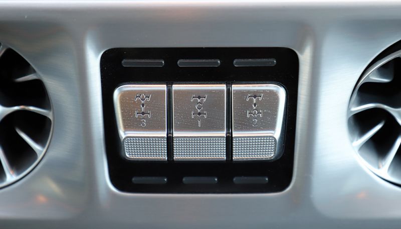 两侧通风口就体现了圆形大灯的形状,而音箱的形状则让人想起标志性梯形转向指示灯的设计。G级越野车一直以来所保持的经典特征还包括副驾驶前方的抓手和三个差速锁的镀铬开关。