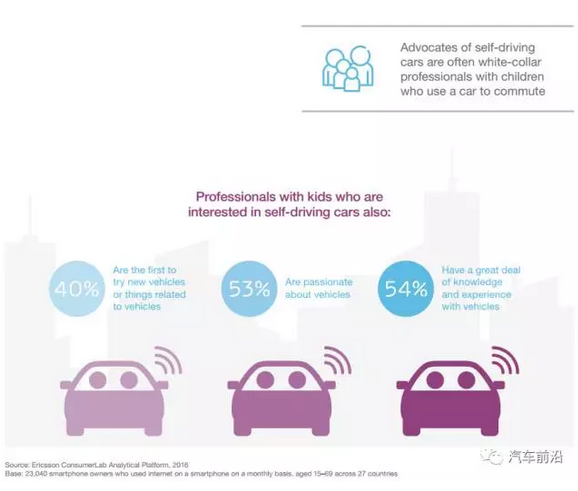 在对喜欢和不喜欢自动驾驶的两个群体进行分析之后发现:自动驾驶的支持者们是那些有孩子的白领人士,他们利用汽车来通勤。在这些人中:40%的人会第一批尝试新车或者与车相关的新事物;53%的人是对汽车非常热爱的;54%的人对汽车有非常多的了解和驾驶经验。