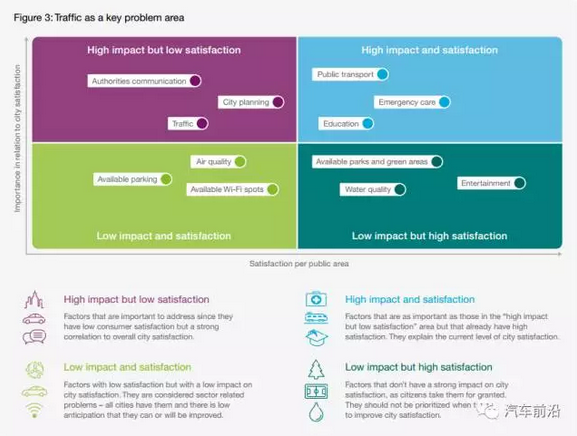 Previous Ericsson ConsumerLab发现:人们对城市最大的负面情绪是来自城市的交通。从下表中可以看到对于生活在城市的人们来说公共交通是最影响人们满意度的,一旦交通得到改善,将极大的提升人们对城市的满意度。