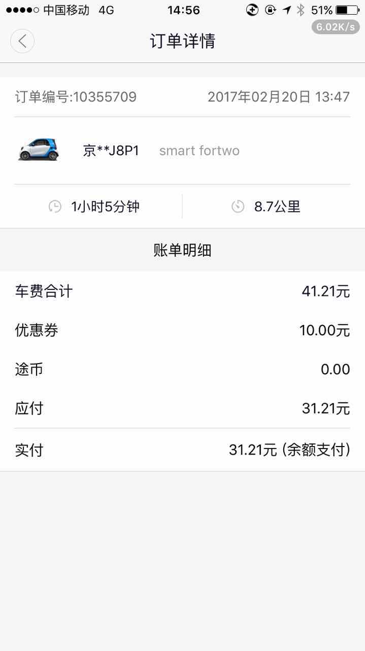 言归正传,这趟“共享”出行开车共耗时1小时5分钟,行驶了8.7公里,合计41.21元,减去赠送的10元优惠券,本次租车消费合计31.21元。