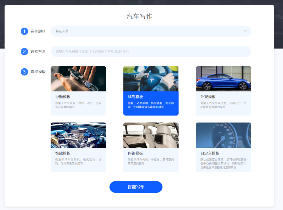 点开汽车写作之后不仅能选择车型,还会有常用的写作类型、例如导购、试驾、外观、性能、内饰等项目,只要选择车型就能生成相应的文章,并且还支持原创功能和图片匹配。