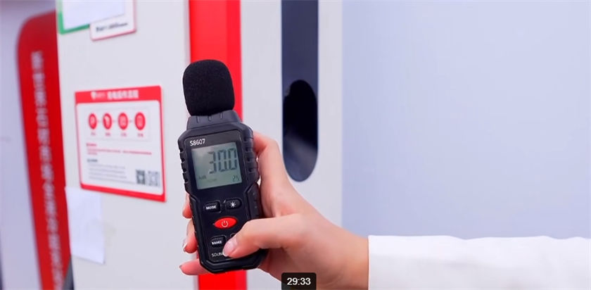 除了充电快,华为全液冷超充采用大尺寸低转速EC风扇,使噪音减少了25%。直播过程中也测试了这一场景,运作的充电桩仅产生大约30分贝的运转声音,用户可以感受安静愉悦的充电体验。