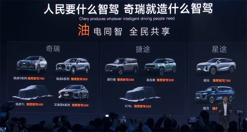 到2025年底,奇瑞将有30余款车型搭载猎鹰智驾,覆盖奇瑞全品牌全系车型,涵盖燃油、混动、增程、纯电全动力形式,并在全球市场同步推进,加速实现“全民、全球、全能源、全场景”平权的智能化战略目标。