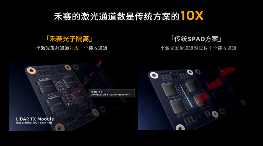 禾赛的激光雷达更像是可编程的 LED 阵列组成的大灯,每一个灯珠都能独立控制;而传统 SPAD 方案更像是几个大灯泡组成的传统卤素大灯,一次只能点亮一片。禾赛光子隔离技术方案,已搭载包括 Pandar 系列、AT 系列、ETX 在内的禾赛各种类型的主激光雷达,可做到物理层面的极致“零误报”,具备远超行业的可靠性。