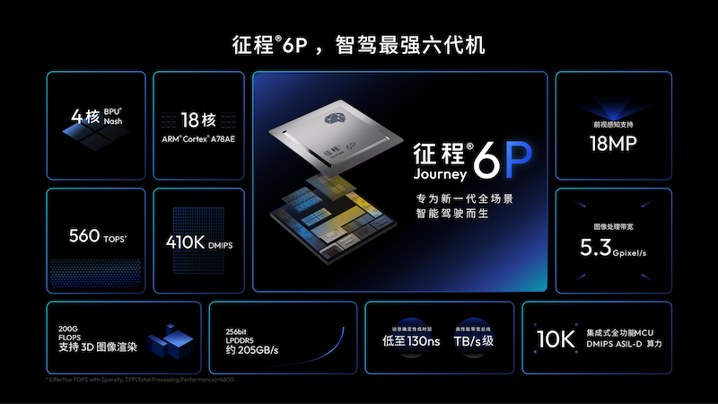 征程6P芯片单颗算力560TOPS,采用地平线自研BPU纳什架构,专为Transformer大模型实时推理深度优化。这一算力水平不仅满足当前需求,更为未来5年的OTA进化预留空间,实现「上市即领先,五年不过时」。