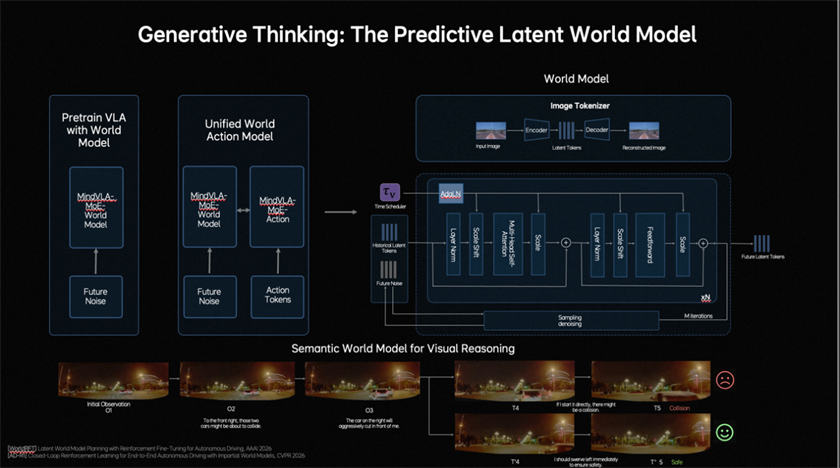 在思考层面,自动驾驶既要理解当前环境,也要预测未来几秒的场景演化。在语言模型承担语义理解、常识知识和交互能力的基础上,理想汽车还引入了预测式隐世界模型,在隐空间中高效模拟未来。训练分三阶段:第一,用海量视频数据预训练Latent World Token(隐世界词元),构建未来表征;第二,在MindVLA-o1中持续世界模型的推演,形成隐空间的未来推理能力;第三,将世界模型、多模态推理能力及驾驶行为进行联合训练与对齐。由此,模型不仅能理解当前场景并进行逻辑判断,还能在隐空间中提前“想象”未来画面,将驾驶决策具象化。理想汽车将这种能力定义为多模态思考(Generative Multimodal Thinking)。拥有多模态思考能力,让模型想得更深。