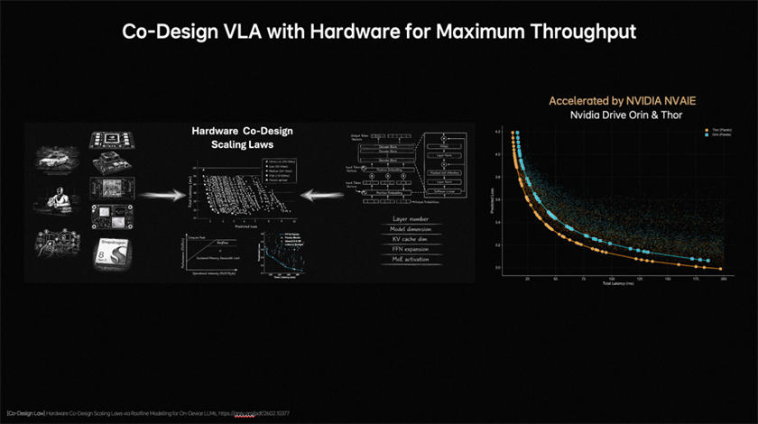 为解决传统端侧大模型部署耗时长、调试频繁的问题,理想汽车提出面向端侧大模型的软硬件协同设计定律,将模型结构与验证损失建模,并结合Roofline模型刻画硬件计算能力与内存带宽限制,在模型性能与硬件约束之间建立统一的分析框架。理想汽车基座模型团队评估了近2000种模型架构配置,在英伟达Orin与Thor平台上完成验证,找到了模型精度与推理延迟之间的Pareto Front(帕累托前沿),将架构探索时间从数月缩短至数天,大幅提升端侧VLA模型的设计与部署效率。在软硬件协同设计定律下,模型部署更高效。