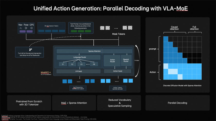 在行为层面,理想汽车构建了统一行为生成(Unified Action Generation)机制。首先,MindVLA-o1使用VLA-MoE(混合专家模型)架构,并引入专门的Action Expert(动作专家),从3D场景特征、导航目标、驾驶指令等多维输入中提取信息,并结合多模态思考生成高精度驾驶轨迹。其次,为满足实时性要求,系统采用并行解码(Parallel Decoding),同时生成所有轨迹点,大幅提升效率。最后,引入Discrete Diffusion(离散扩散)进行多轮迭代优化,类似逐步去噪,确保轨迹空间连续、时间稳定,并符合车辆动力学约束。形成统一行为生成机制,使模型行得更稳。