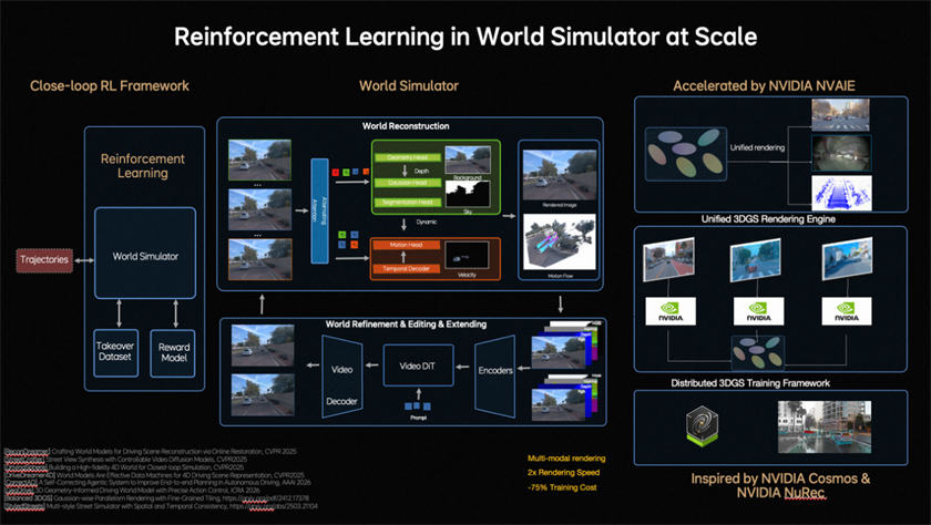 在模型迭代层面,理想汽车构建了闭环强化学习框架,让模型不仅能从真实数据学习,还能在世界模拟器(World Simulator)中持续探索和优化策略。为此,理想汽车将传统逐步优化式重建升级为Feed-forward(前馈)场景重建,使系统能够瞬时生成大规模、高保真驾驶场景,支持大规模并行训练。同时,结合生成式模型(Generative Models),模拟环境可扩展、编辑并生成全新场景。为支持大规模模拟与训练,理想汽车开发了统一的3D Gaussian Splatting(3D高斯泼溅)渲染引擎和分布式训练框架,渲染速度提升近2倍,整体训练成本降低约75%,实现低成本、高效率的强化学习闭环。在闭环强化学习框架下,模型实现更快进化。