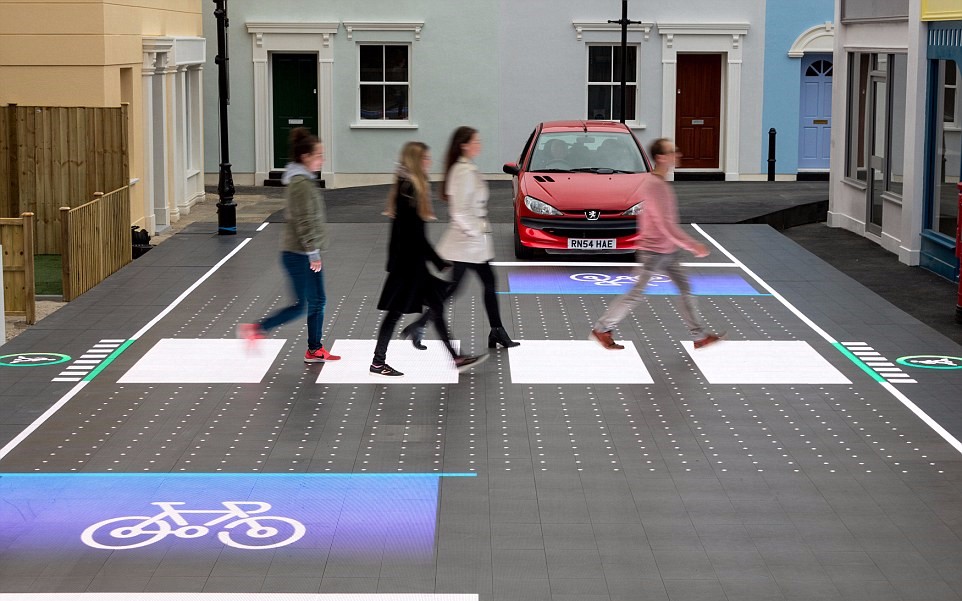 也就说,当有行人过马路时,交互式显示器开始工作地面上就会出现灯光,显示出最安全的路线,以提前行驶和警告司机和骑自行车的人。