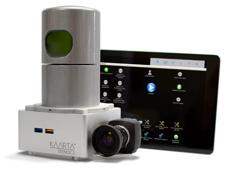 Stencil集成了三维测绘和实时位置估算,能创建固基扫描系统无法实现的功能。Stencil 2-32采用Velodyne HDL-32E激光雷达传感器,范围可达100米,数据速率为每秒72万点。Kaarta利用先进的机器人技术,将多个传感器——激光雷达、视觉测程和惯性测量单元(IMU)——的输入相整合,并实时处理这些数据。对于一些应用,可以使用全球导航卫星系统(GNSS)定位和轮式里程计传感器来增强数据。
