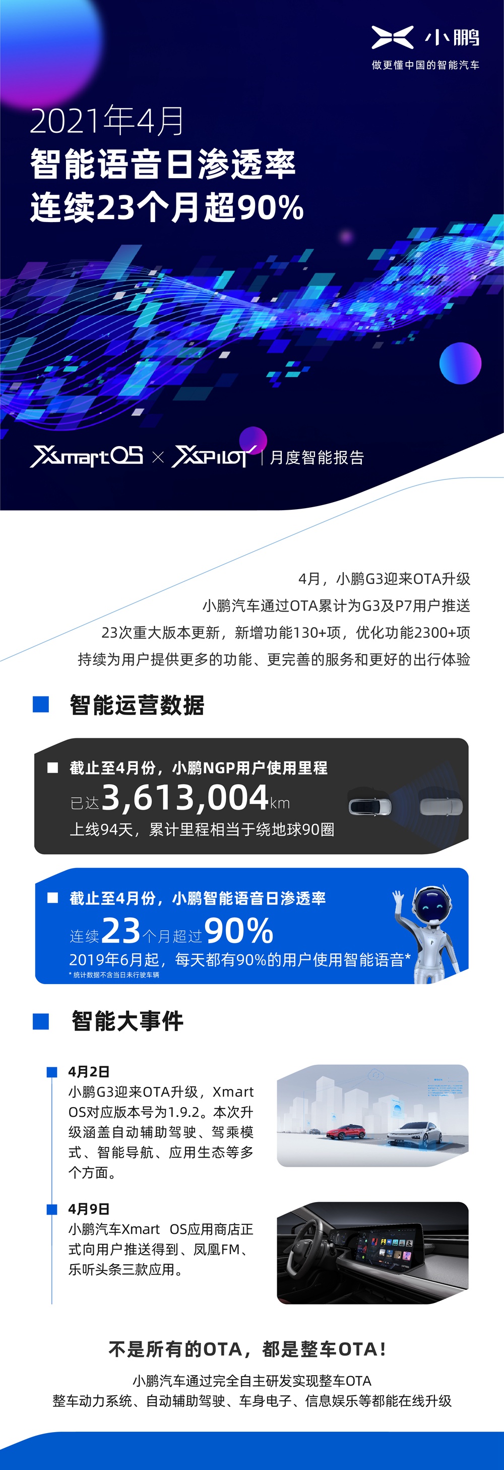 小鹏汽车发布4月份月度智能报告,智能语音日渗透率连续23个月超90%
