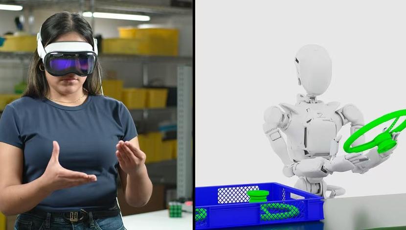 首先通过 GR00T-Teleop 工作流,用户可以借助 Apple Vision Pro 在数字孪生环境中捕捉人类动作。这些人类动作会被记录下来作为金标准,并在仿真环境中由机器人模仿学习。