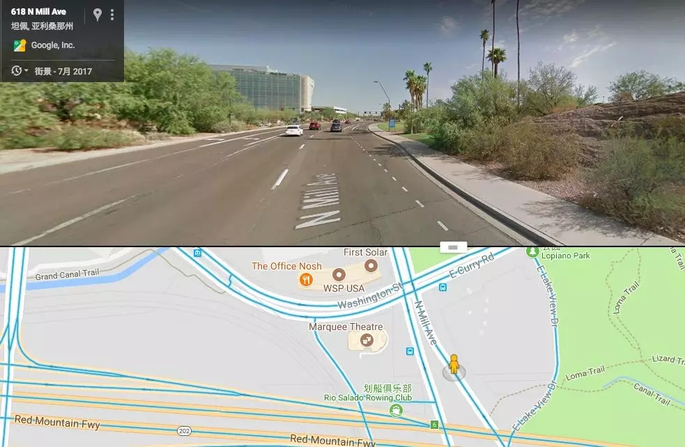 事故发生的街道(上)以及受害者穿越马路的地图。图片是2017年7月的谷歌街景